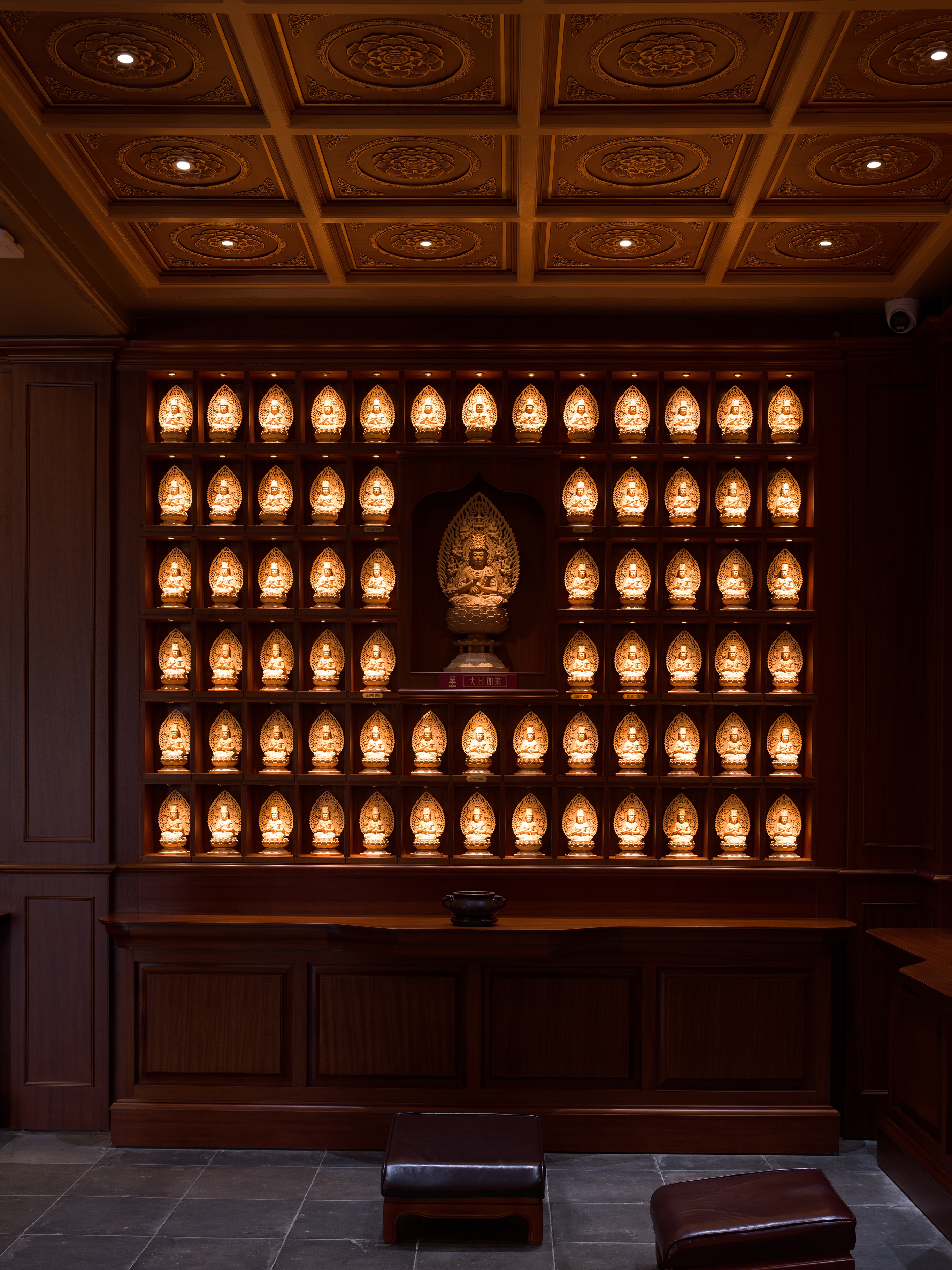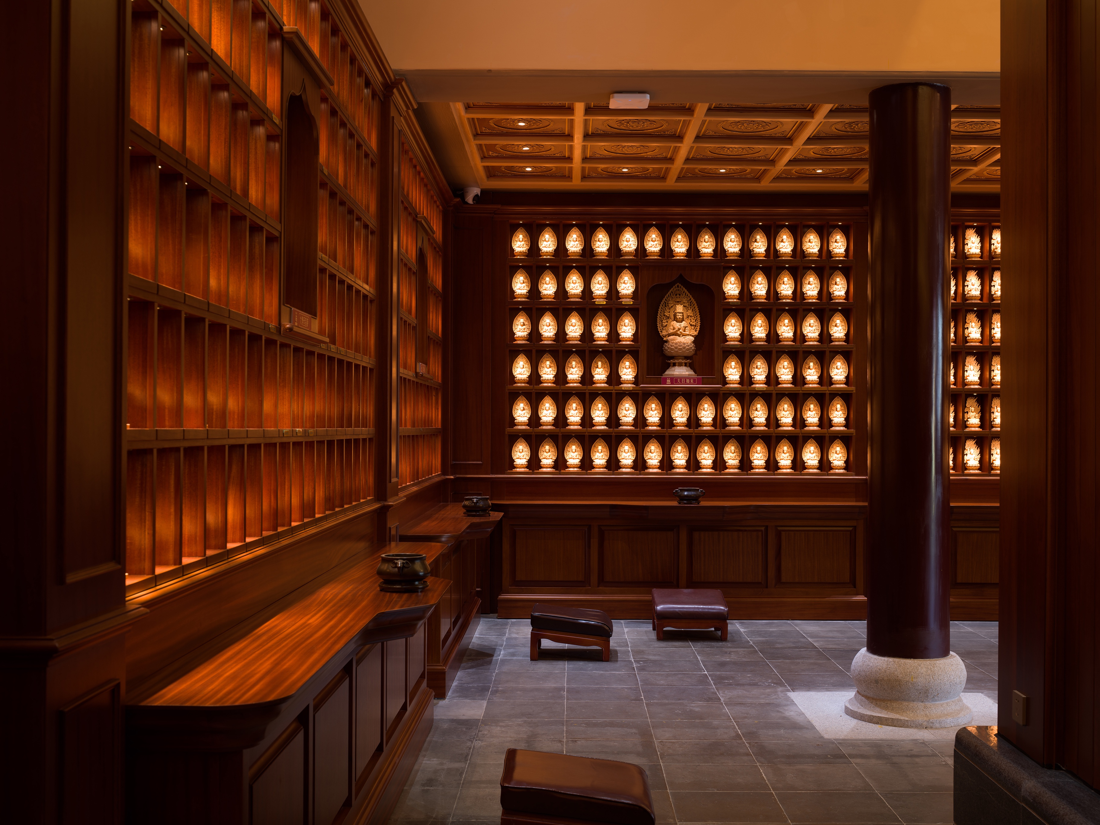 大殿定制護(hù)墻以幾何線條裝飾,勾勒出韻律與立體層次。飾面木紋肌理生動(dòng),幽微光影映照之間,空間氣質(zhì)愈顯典雅莊穆。