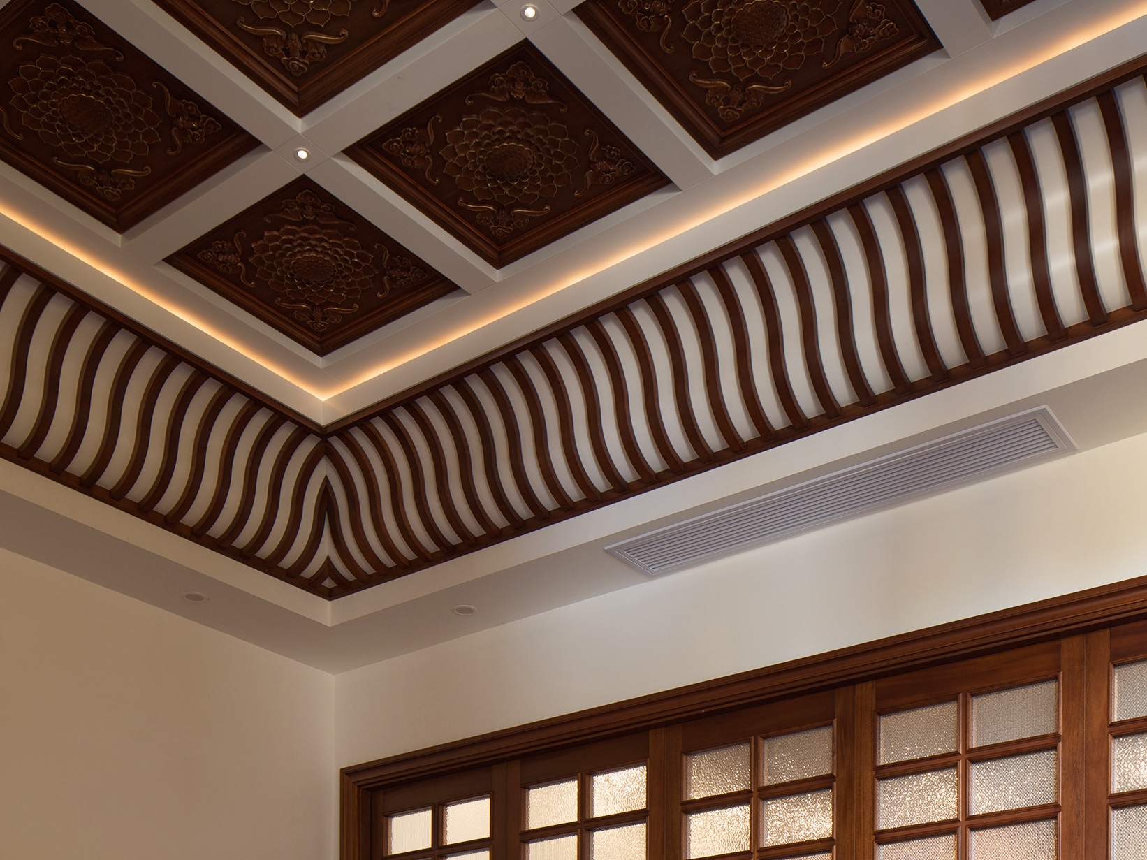 頂棚設(shè)計(jì)別具匠心,以130根三彎實(shí)木料模擬傳統(tǒng)屋檐弧度,婉轉(zhuǎn)靈動(dòng),復(fù)刻中式建筑的韻致之美。頂部嵌飾十二塊雕板,以蓮花寓清凈,以蝙蝠兆吉祥,古典紋樣與現(xiàn)代空間相映成趣。